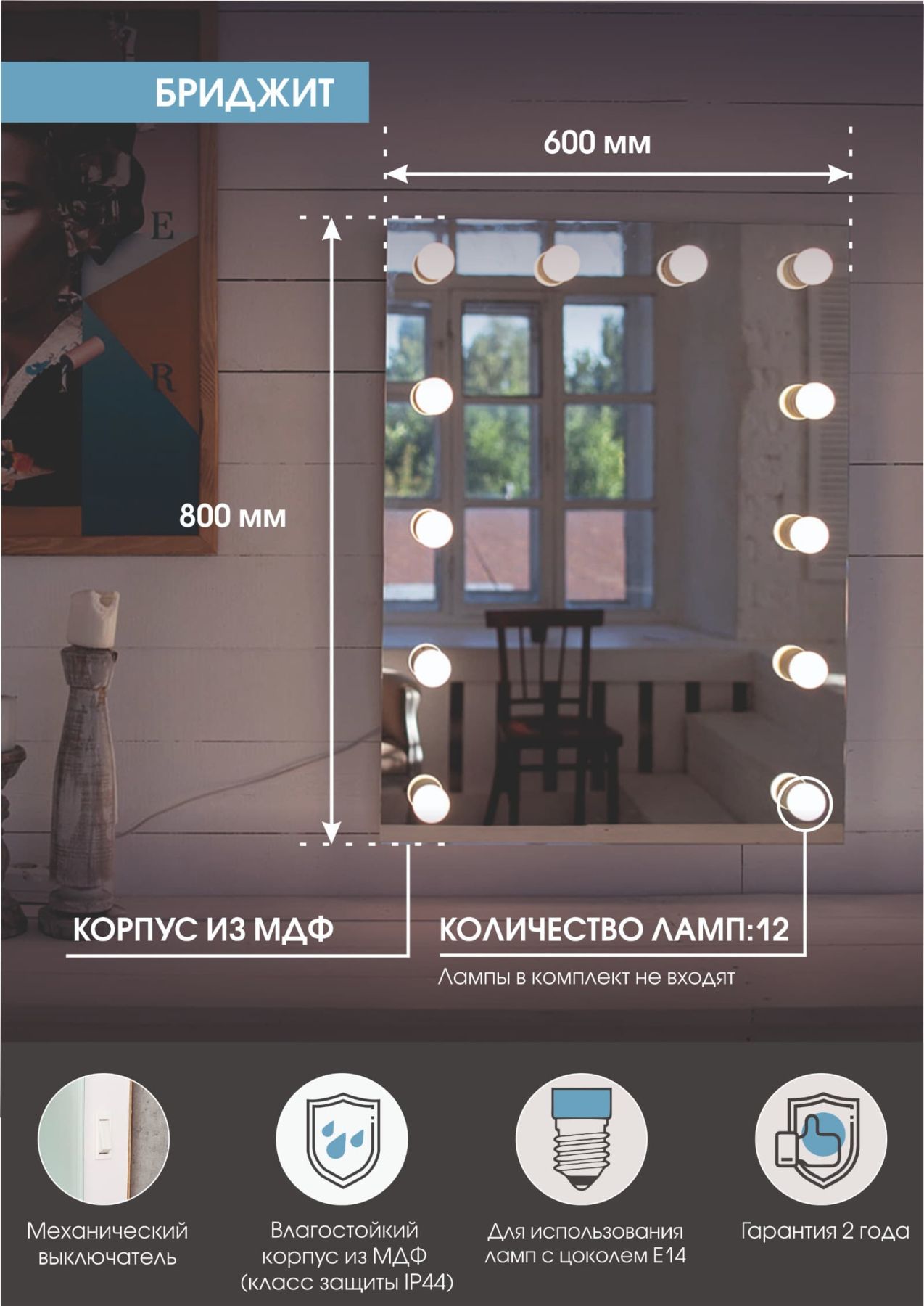 Гримерное Бриджит со встроенными Led лампами (12 ламп) 600х800 LED подсветкафункция изменения теплоты подсветки (холодная/нейтральная/теплая)механический выключатель